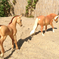 Zapewne nikt nie spodziewał się, że moje dwa nowe Classici to źrebaki. Ja jednak jest nimi zachwycona. Są idealne moim zdaniem. Wyrzeźbiła je oba Kathleen Moody. Na początku, zanim do mnie przyjechały zastanawiałam się nad przemalowaniem jednego, tak by oba pasowały do Camilli. Jednak gdy je wypakowałam, stwierdziłam ze nigdy go nie przemaluje, jest zbyt piękny, nie mogę go pozbawić tej cudnej maści. Dlatego jasny maluch u mnie będzie Haflingerem, trochę ciemniejszym niż matka, ale to po ojcu :) A drugi maluch, będzie jego adoptowanym bratem. Oglądałam kilka tradów i uważam że te źrebaki są lepiej wyrzeźbione niż niektóre z nich :) Mam nadzieje że i wam się spodobaja moje maluszki, zapraszam do oglądania, tradycyjnie, sesja na pustyni :)