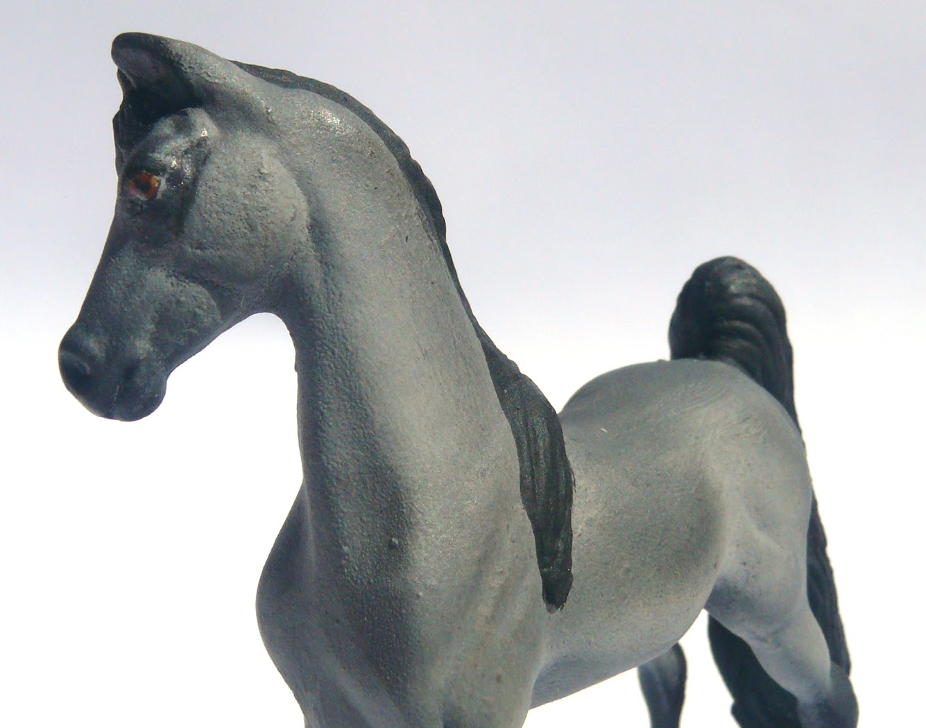 Tak jak wam obiecywałam pokażę wam dzisiaj jak w tej chwili wygląda klacz Stablemates z zestawu New Arrivals. Źrebak nie może się już doczekać kiedy jego mamusia wróci i spokojnie, wybrałam maść tak by do siebie pasowały. Jak na razie zmianie uległa jej sylwetka, a dokładnie grzywa i ogon, a dzisiaj dostała pierwszą warstwę pasteli i zaczyna zmieniać kolorek sierści, czyli siwieje nam malutka, bo jakoś kara maść mi zupełnie do niej nie pasowała. Oczywiście cudowne zmiany zawdzięczamy Amalltei, którą polecam każdemu kto marzy o zmianie maści i nie tylko, modeli :) Cały czas zastanawiam się czy ogon i grzywa mają być czarne czy też wysiwiałe. Może wy mi pomożecie zdecydować? pokażę wam na zdjęciach o co dokładnie mi chodzi, bo sama przejrzałam setki fotek siwków i nie mam pojęcia co wybrać, obie opcje mi się podobają.